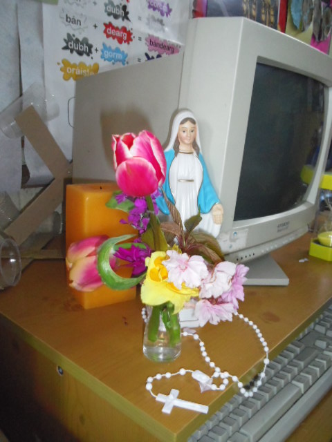 We have a little May altar with a statue of Mary, a candle, some lovely fresh flowers and a rosary beads.
